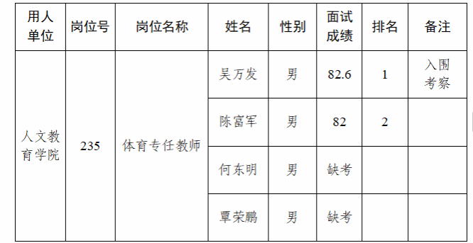 beat365官网2024年9月30日发布的《beat365在线唯一官网2024年公开招聘工作人员(第一批)面试成绩及入围考察人员名单的公告》中,体育专任教师岗位面试成绩有误,现予以更正。更正后信息: