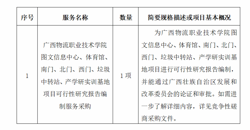 广西众联工程项目管理有限公司受beat365在线唯一官网委托,根据相关法律法规规定,现对beat365在线唯一官网图文信息中心、体育馆、南门、北门、西门、垃圾中转站、产学研实训基地项目可行性研究报告编制服务采购进行竞争性磋商采购,欢迎符合条件的供应商前来参加磋商活动。