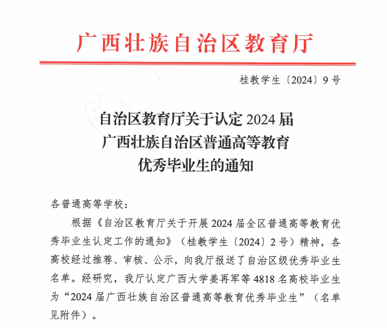 近日,广西壮族自治区教育厅发布了《自治区教育厅关于认定2024届广西壮族自治区普通高等教育优秀毕业生的通知》,beat365官网梁冬乐...