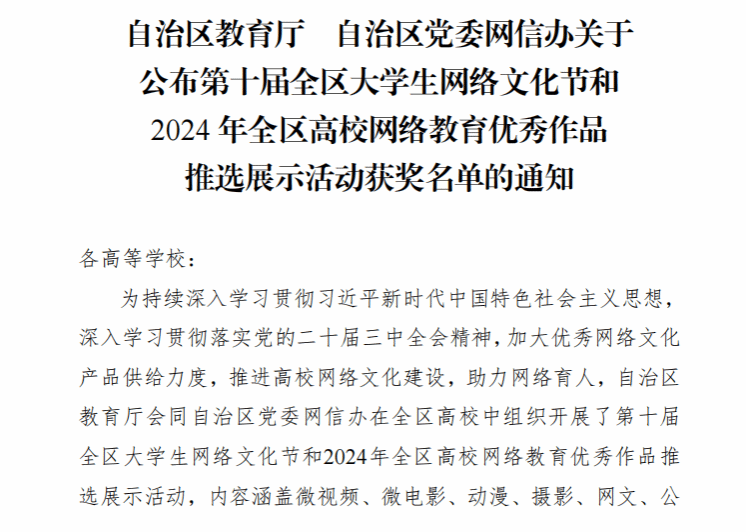 近日,自治区教育厅、自治区党委网信办下发《自治区教育厅 自治区党委网信办关于公布第十届全区大学生网络文化节和2024年...